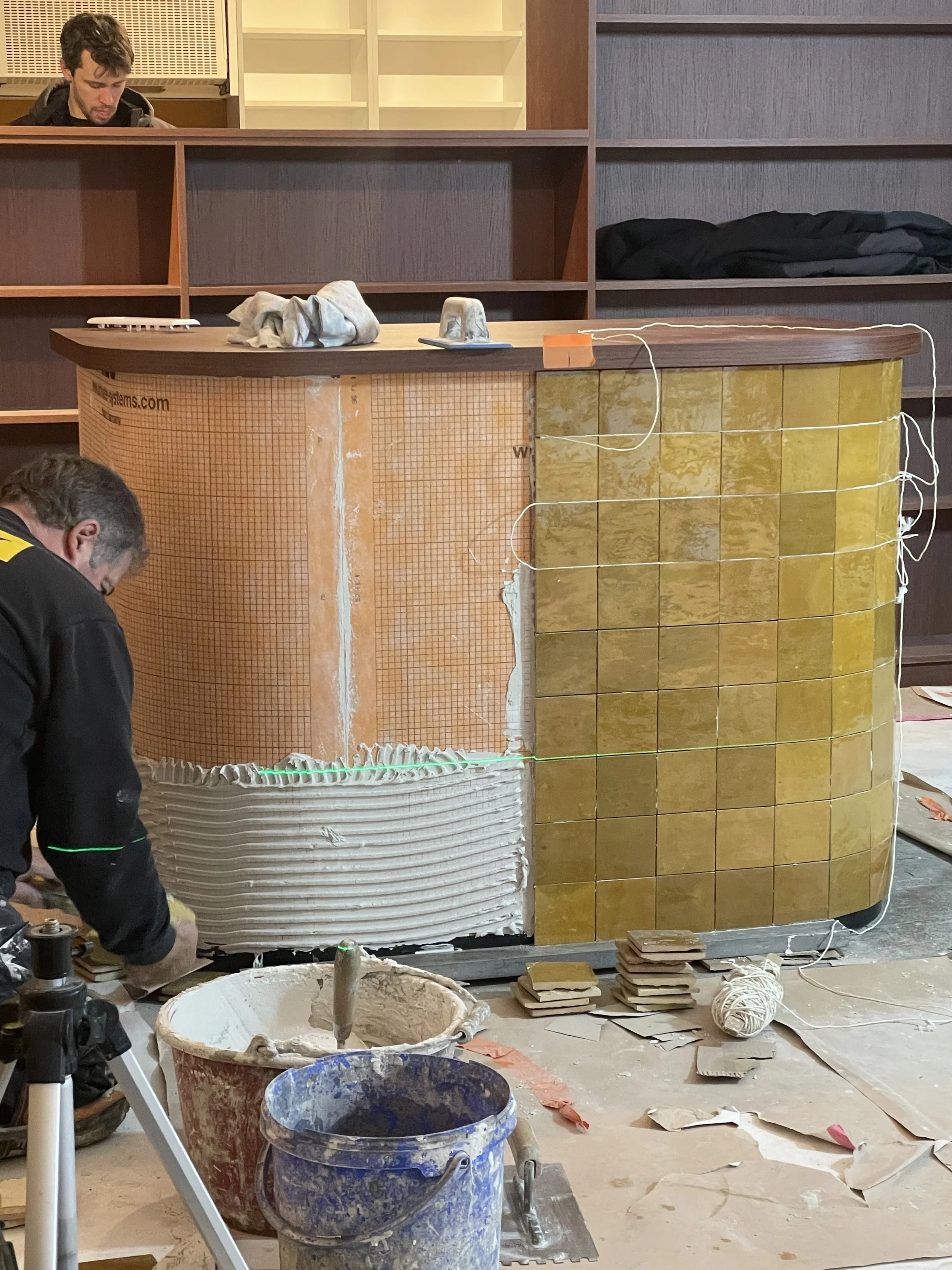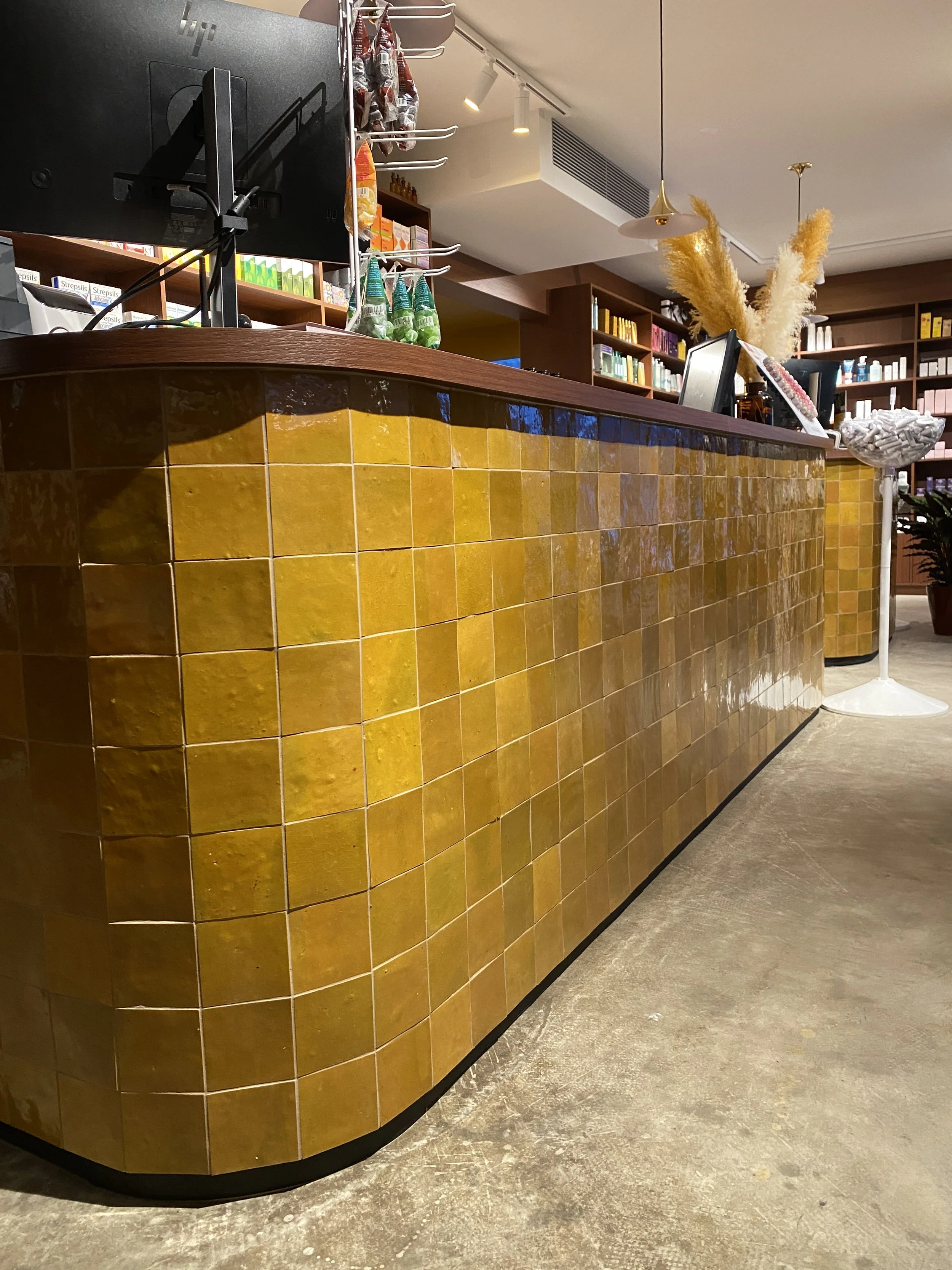 De inrichting van deze apotheken is op zijn minst origineel te noemen. Bij het binnenkomen voel je meteen de warme sfeer van het interieur en ons team droeg hieraan bij. In de eerste werden de groene tegels secuur op de toog en achter de wastafel geplaatst en afgewerkt met de tekst ‘green is the new black’. In de andere apotheek werd voor warmgele zelliges gekozen voor beide toonbanken.