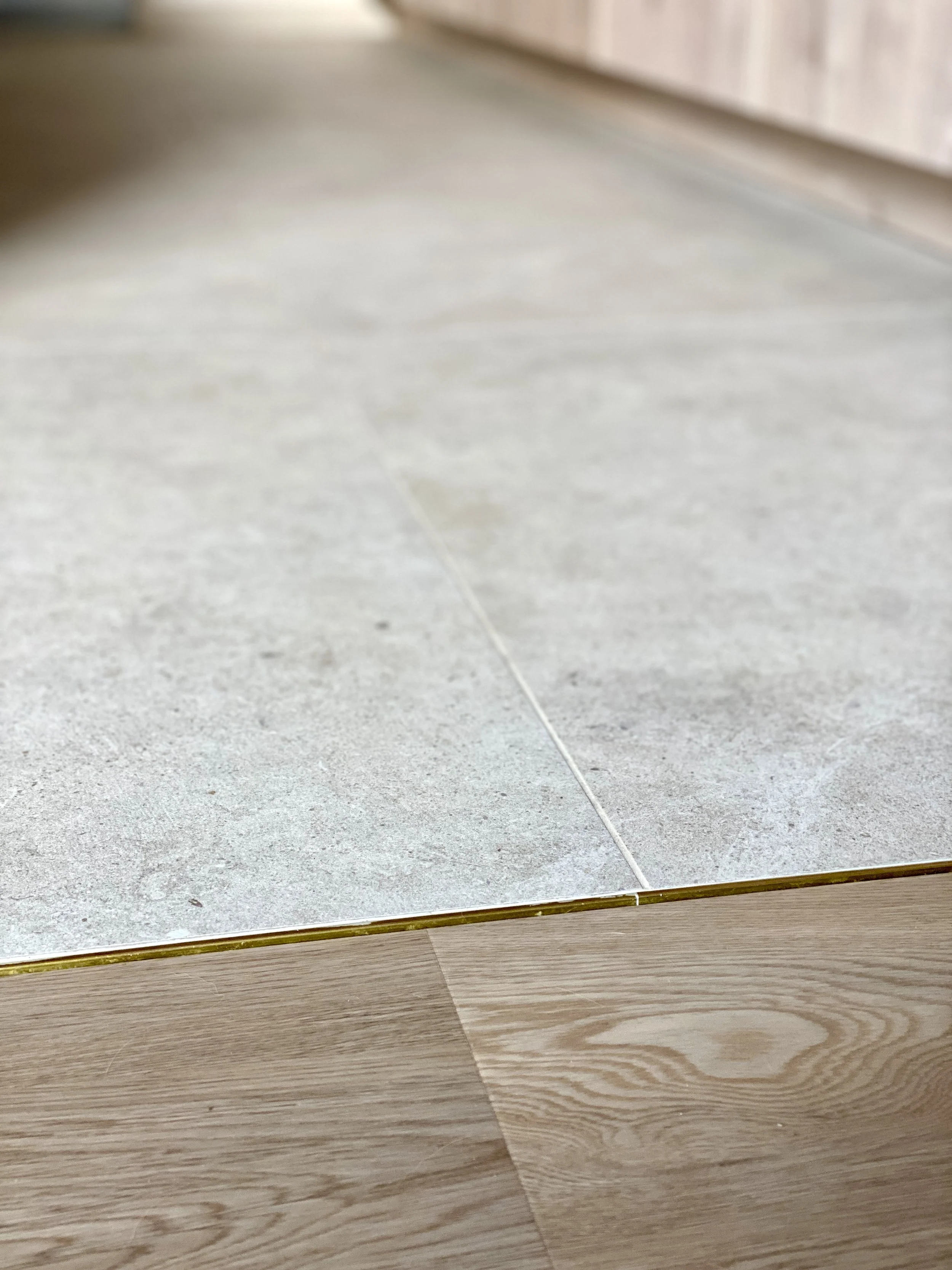 De details maken het geheel veelal af en dat tonen we graag met deze realisatie. In de keuken legden we deze messing voeg als overgang tussen de grote tegels en de parket van de living. De voeg gebruikten we ook in de gang naar de voordeur om de ingewerkte mat mee te omzoomen.