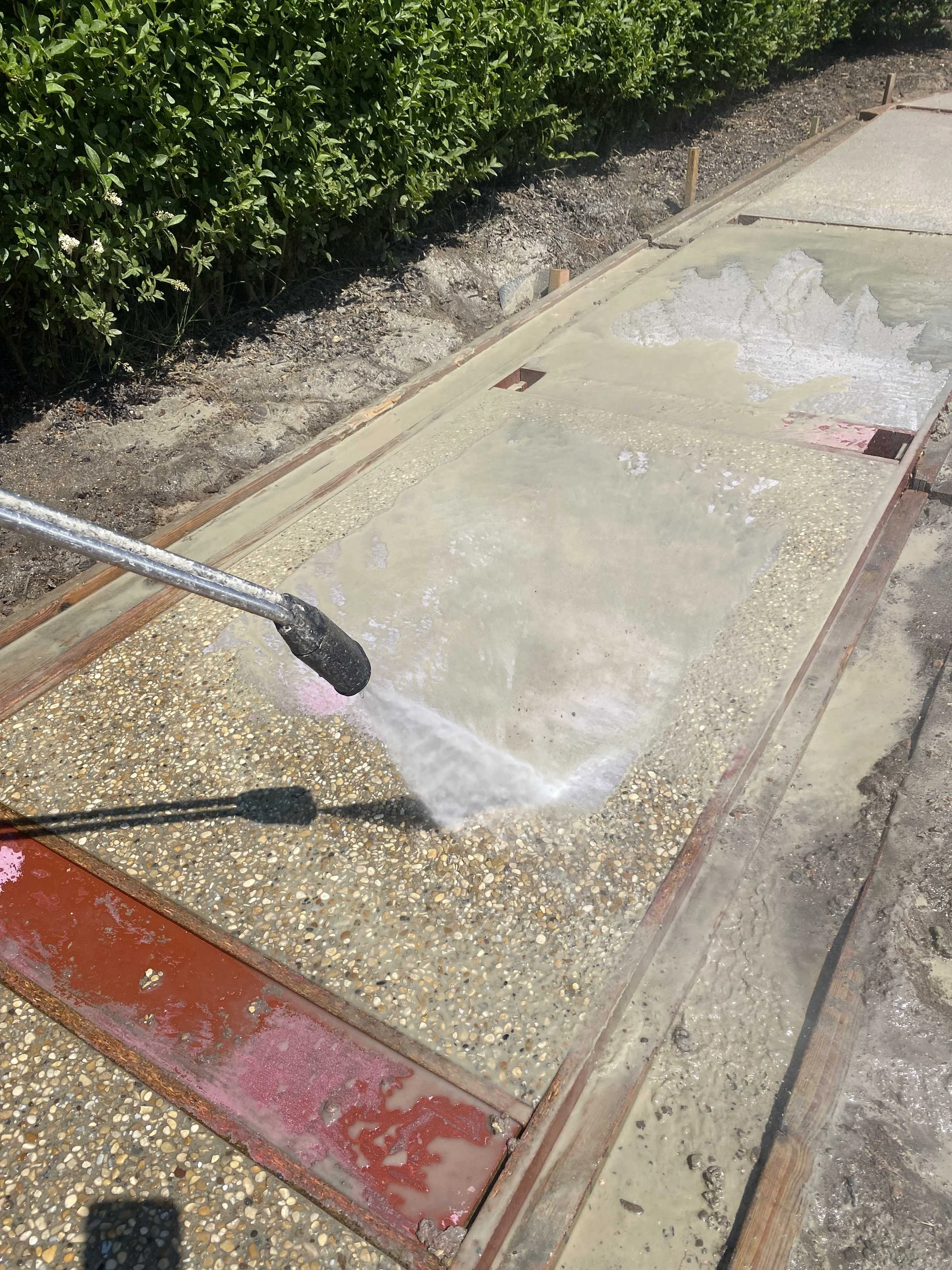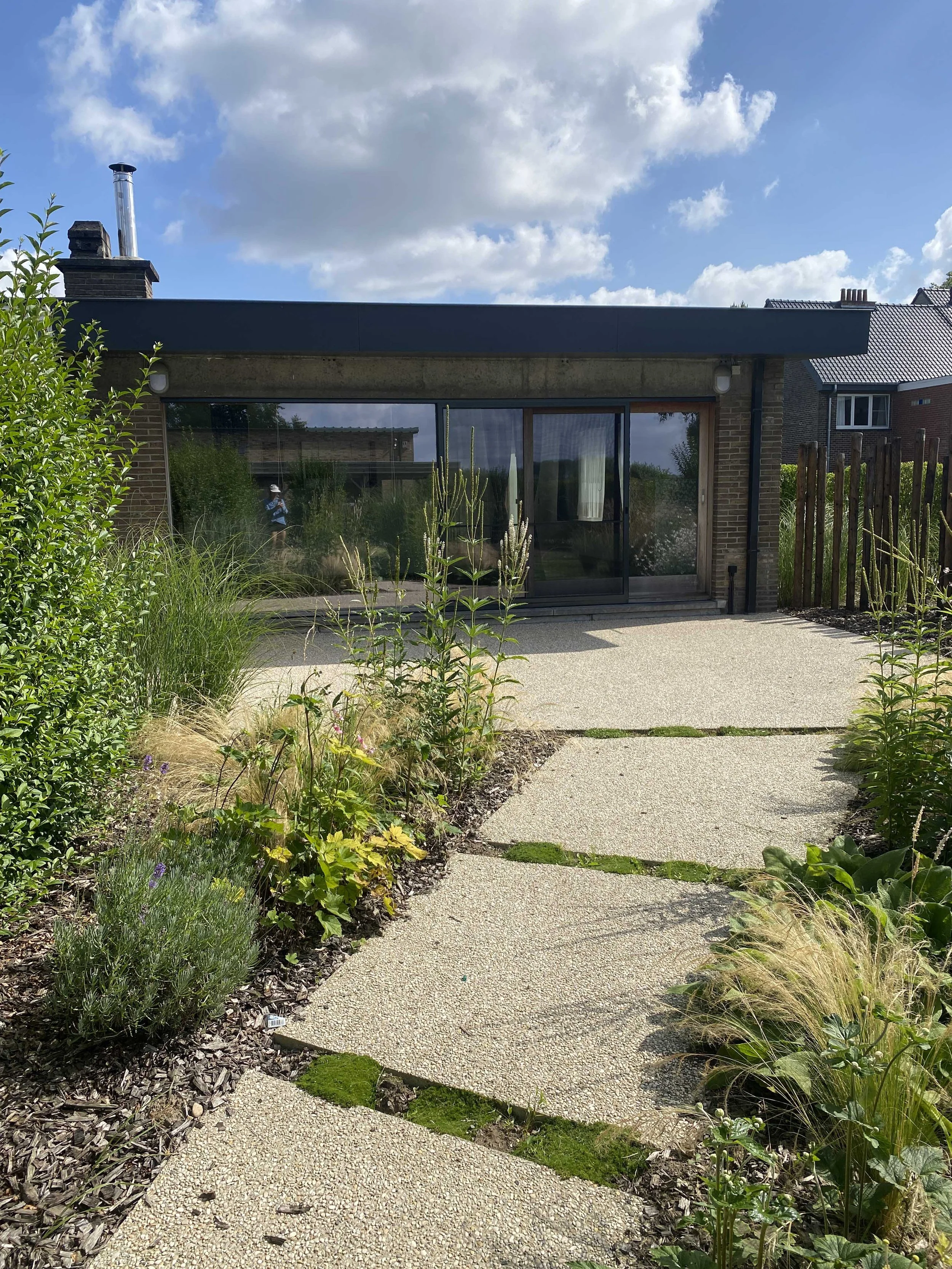 Het terras aan deze bungalow met jaren ‘70 vibes, was aan vervanging toe en uiteindelijk kreeg de hele tuin een geslaagde mak-over met ook grote stapstenen in uitgewassen beton.