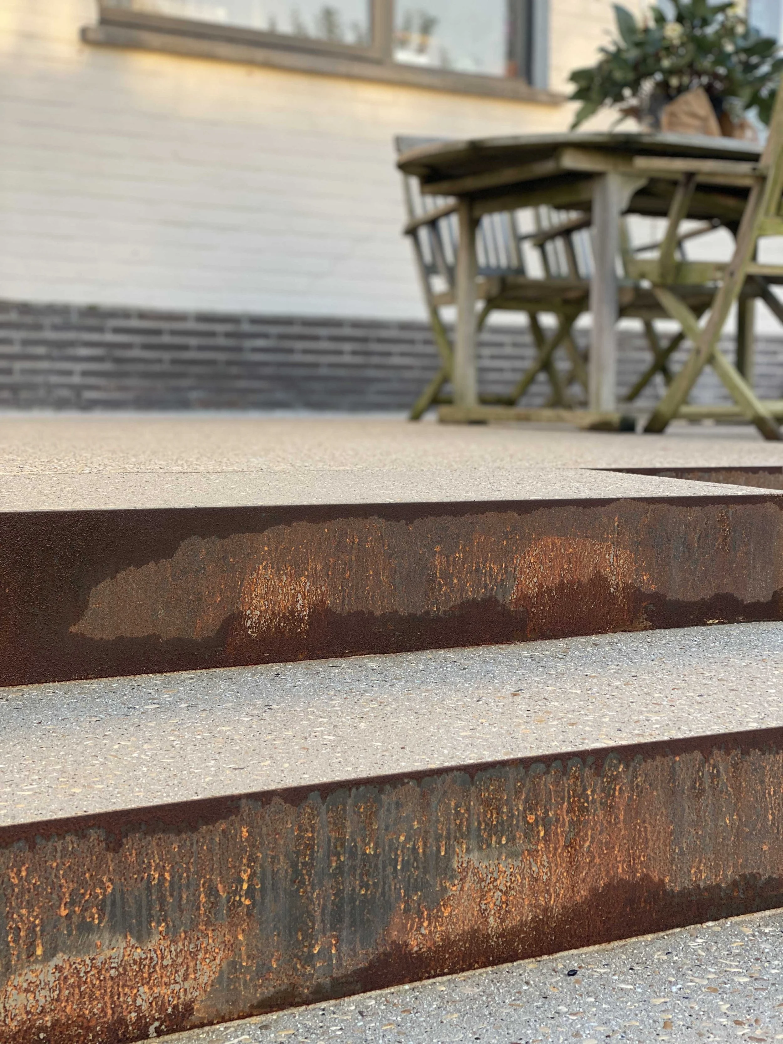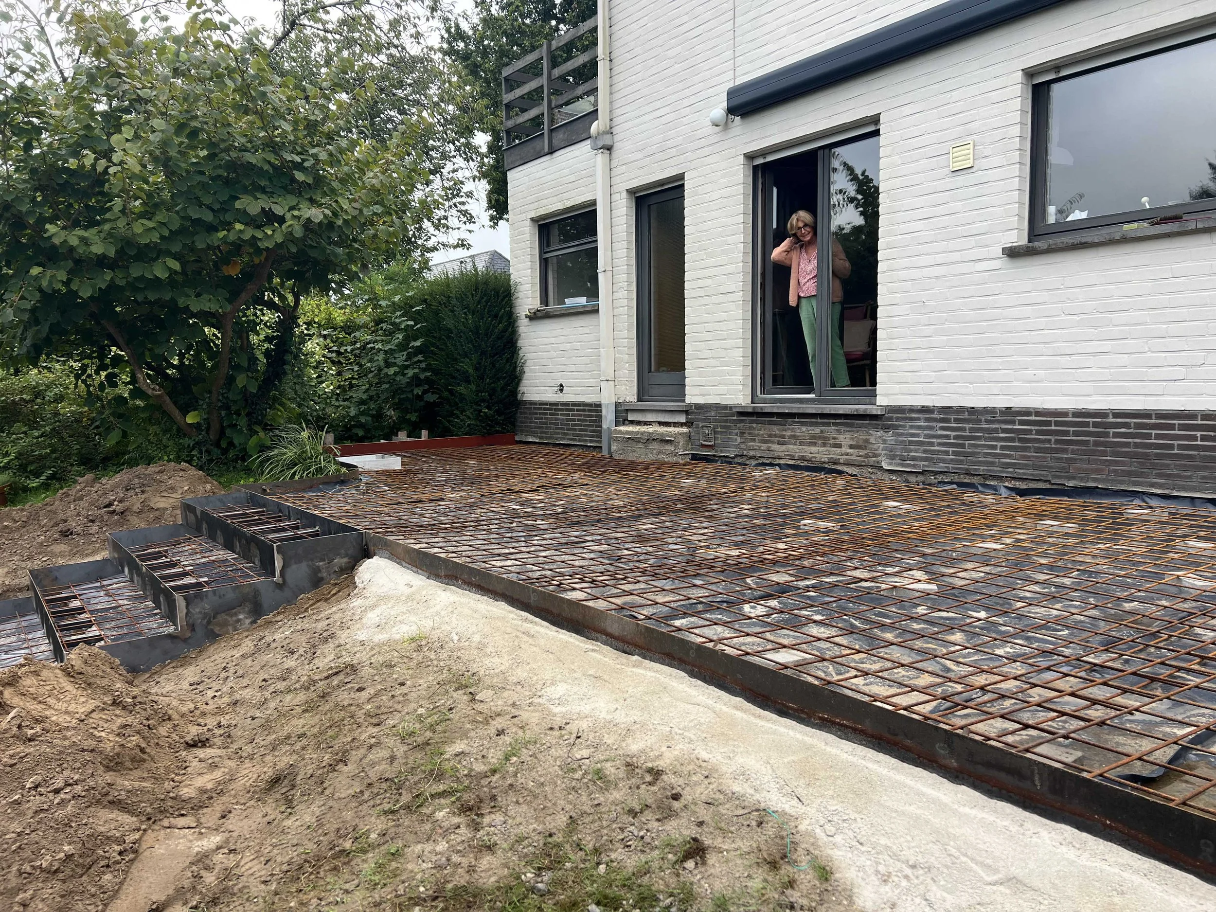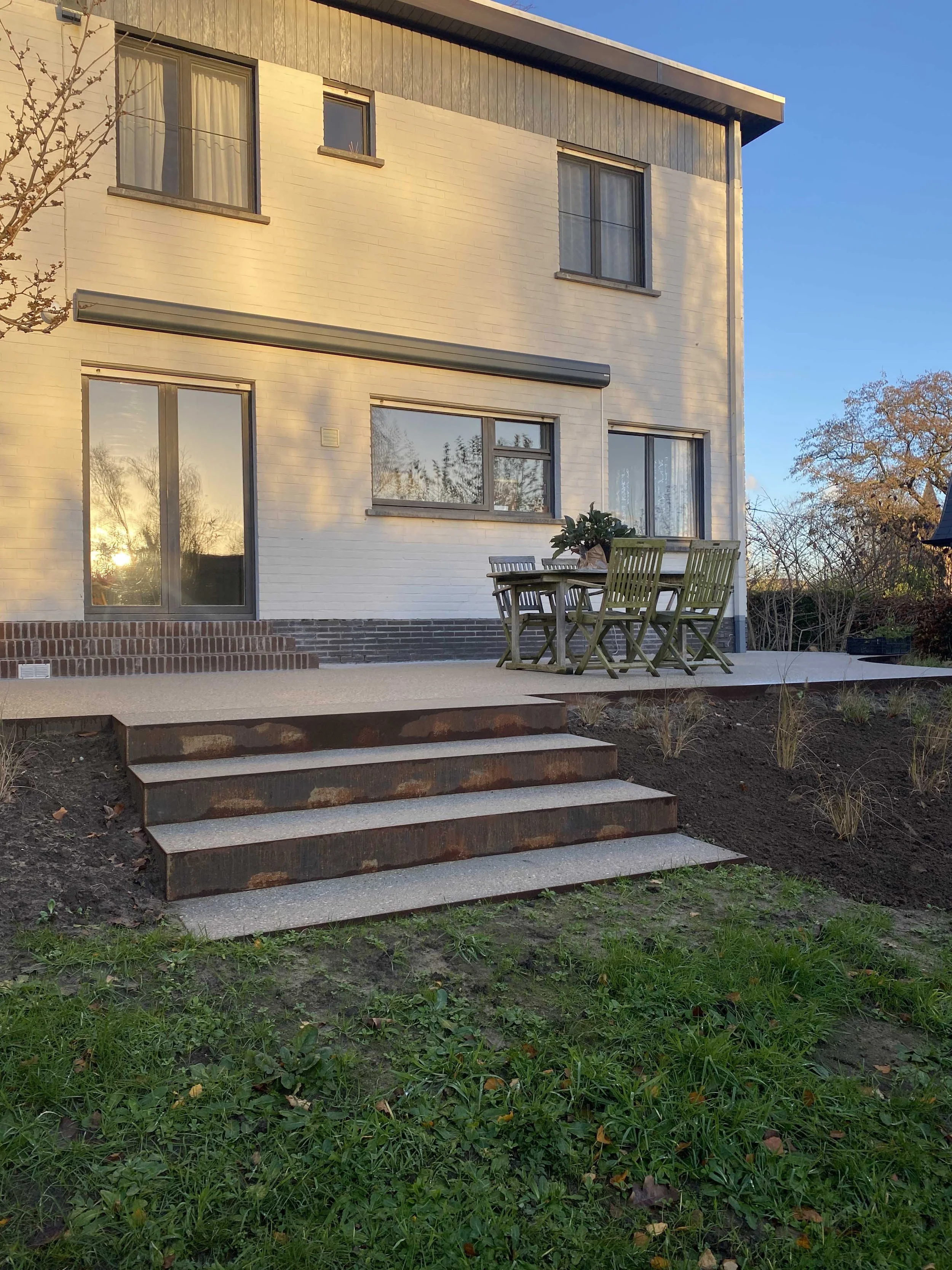 Project CON 9 Verhoogd terras in uitgewassen beton. Dit terras past volledig bij de sfeer van het huis.